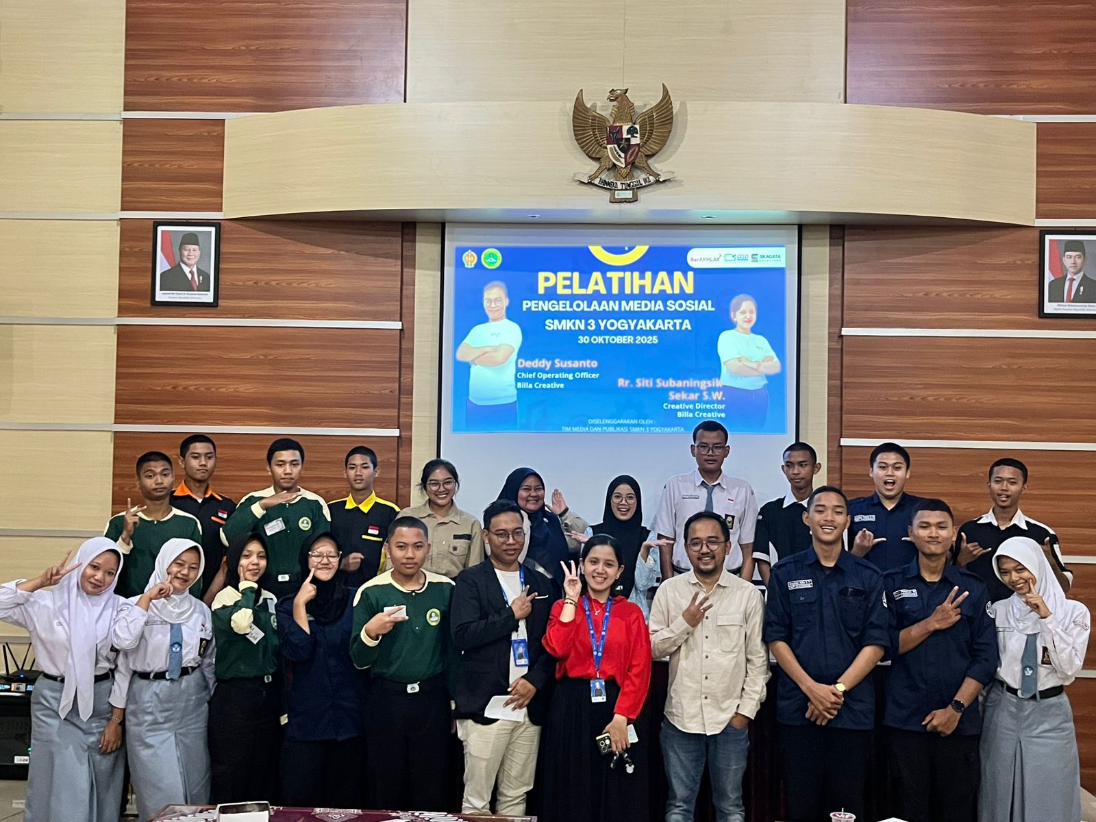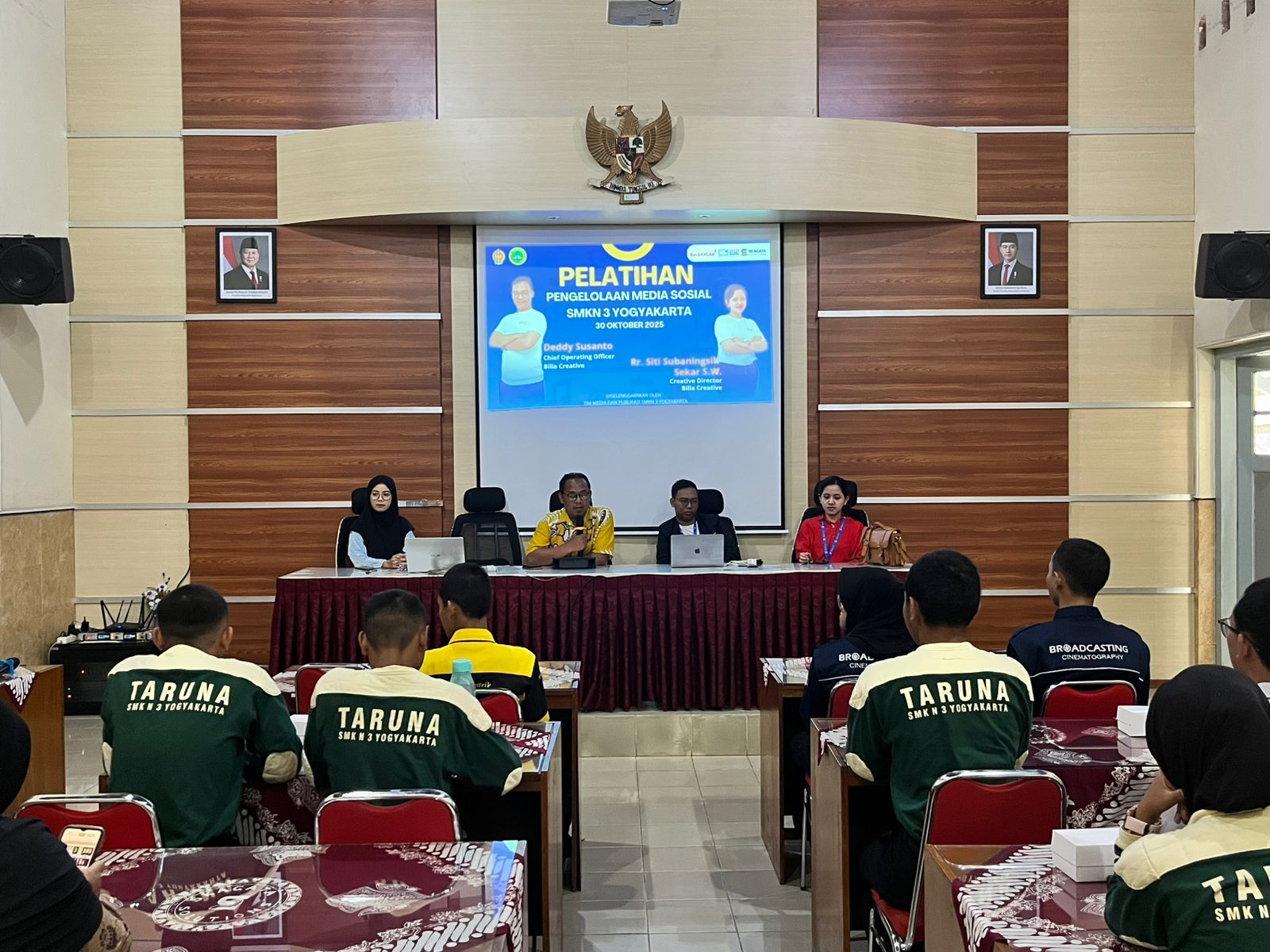 Kegiatan ini diikuti oleh 19 peserta yang merupakan admin media sosial dari masing-masing ekstrakurikuler di SMKN 3 Yogyakarta. Mereka merupakan siswa terpilih yang bertugas mengelola publikasi kegiatan organisasi di ranah digital. Pelatihan menghadirkan dua narasumber profesional dari Billa Creative, yakni Deddy Susanto, Chief Operating Officer, dan Rr. Siti Subaningsih Sekar S.W., Creative Director. Keduanya berbagi pengalaman nyata mengenai strategi pengelolaan media sosial yang efektif, kreatif, dan beretika.